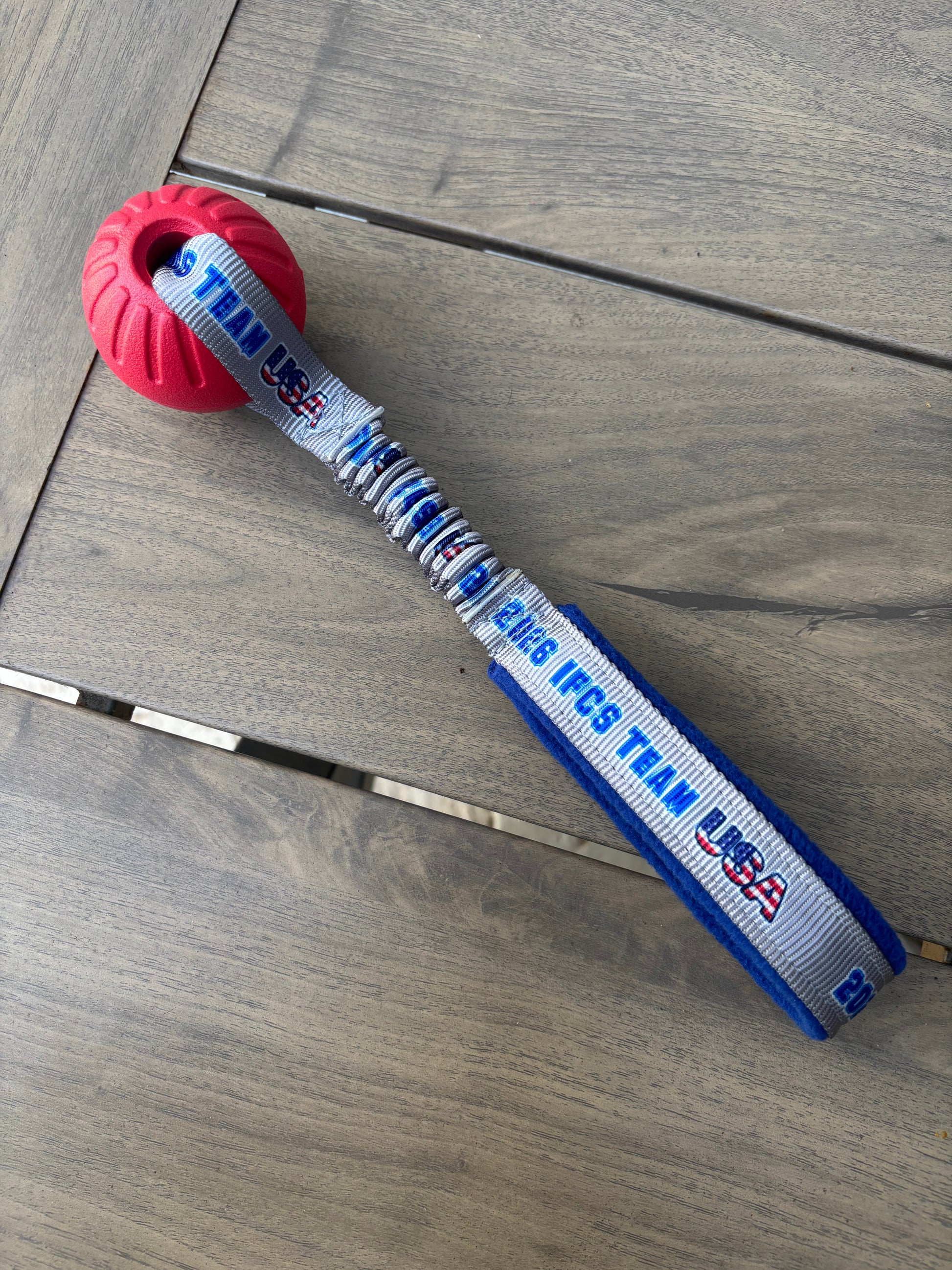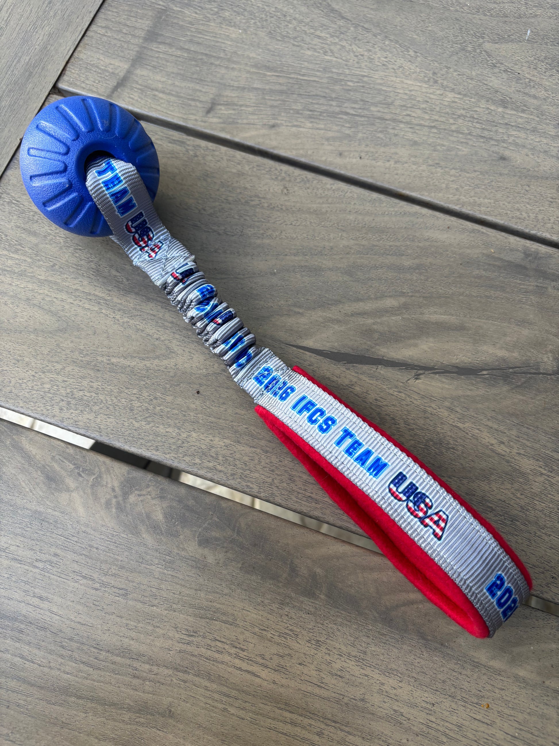 The tug: a foam ball in red or blue with silver 2026 IFCS Team USA webbing. You can choose ball size and color.